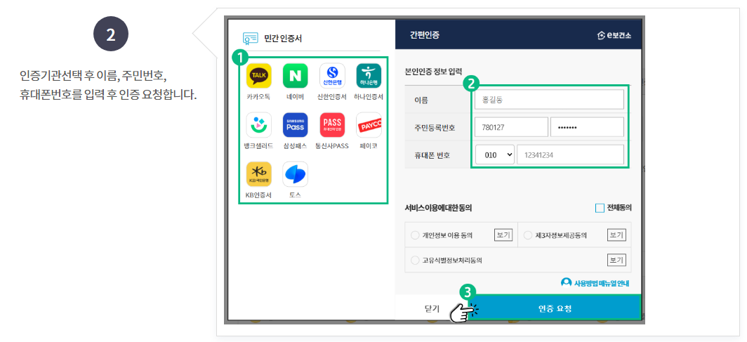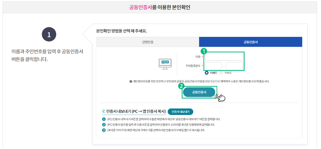 | 공인인증서 | 본인 인증 | 개인정보 정확히 입력 |
