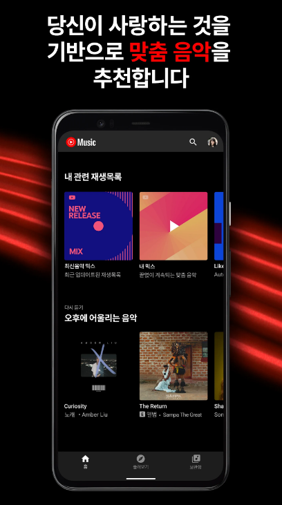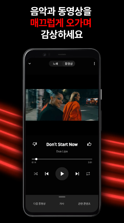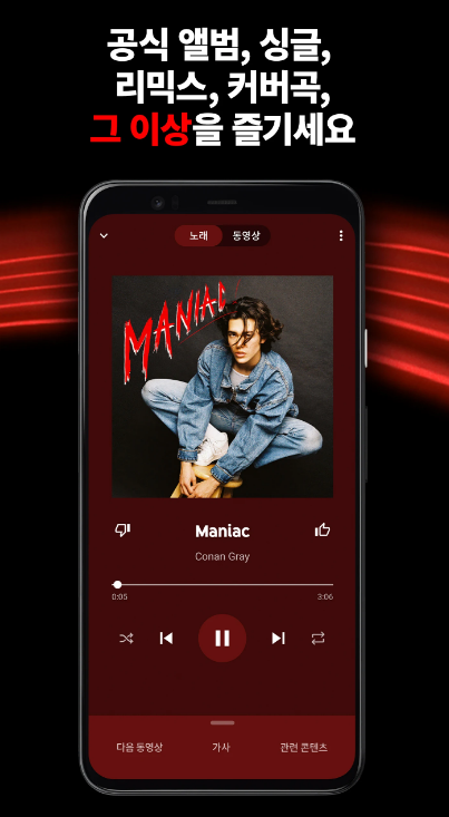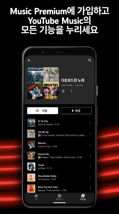 - 곡 내려받기: 원하는 곡이나 플레이리스트을 미리 내려받기하여 인터넷 연결 없이도 재생할 수 있습니다.