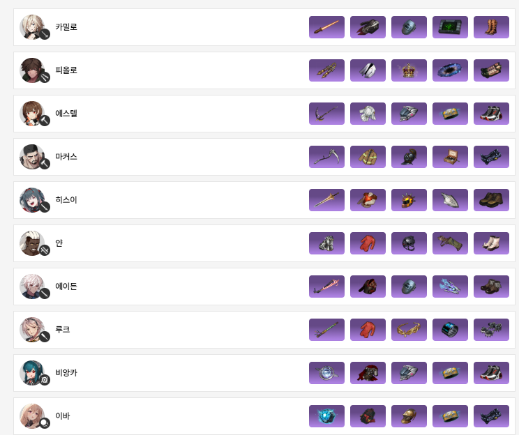 캐릭터별 인기 아이템 빌드
