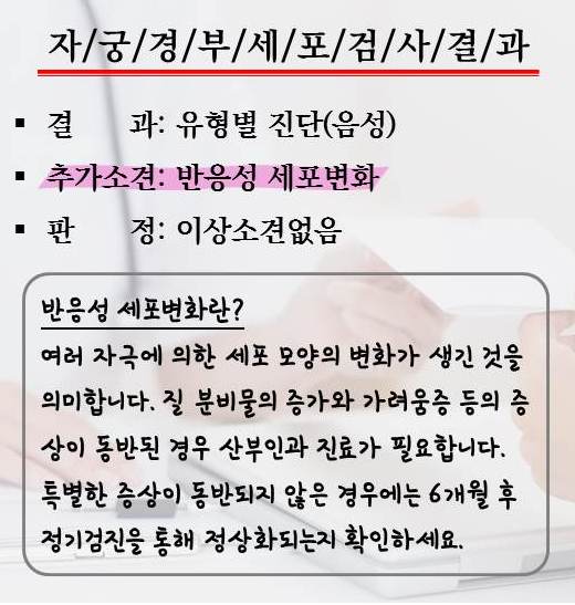 반응성 세포 변화는 자궁경부암 검사에서 자주 나타나는 현상으로, 대부분 염증이나 호르몬 변화로 인해 발생합니다. 정기적인 검진과 적절한 치료가 필요합니다. 이를 통해 건강한 자궁을 유지하고, 예방적 관리가 중요함을 명심해야 합니다.