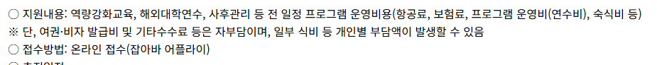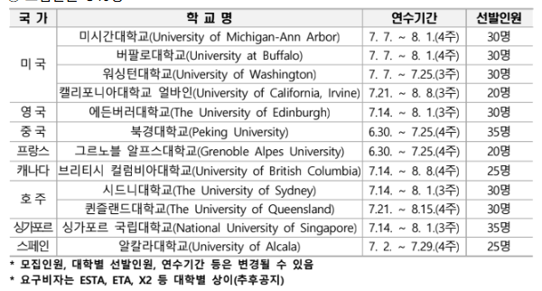 이 프로그램에서는 역량 강화 교육, 해외 대학 연수, 사후 관리를 포함한 전 일정 프로그램 운영비용을 지원합니다. 연수 대학은 미국, 영국, 중국, 프랑스, 캐나다, 호주, 싱가포르, 스페인 등 총 8개국 12개 대학에서 진행됩니다. 해외 대학 연수는 어학 수업과 현지 문화 체험, 자기 주도 프로젝트를 통해 이루어집니다.