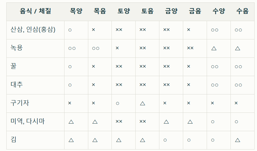 각 필요한 음식과 금해야 할 음식이 명확하게 구분되어 있습니다. 예를 들어, 목양체질은 산삼, 인삼을 유익하게 섭취해야 하며, 수양은 꿀과 대추를 반드시 섭취해야 합니다.