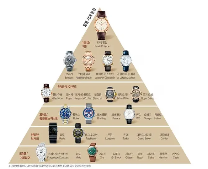역사, 기술력, 디자인, 희소성 등을 기준으로 평가됩니다. 이 기준에 따라 시계 브랜드는 여러 등급으로 나누어집니다.