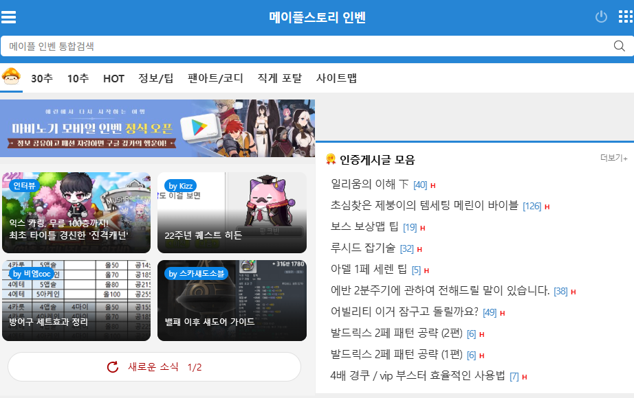 메이플인벤은 모바일 웹사이트를 통해 사용자가 자유게시판, 실시간 소식/공지, 팁과 노하우 등 다양한 게시판을 쉽게 이용할 수 있도록 최적화되어 있습니다.