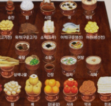 | 4열 | 나물, 김치, 포, 식혜 | 건강과 장수를 기원하는 반찬류 |