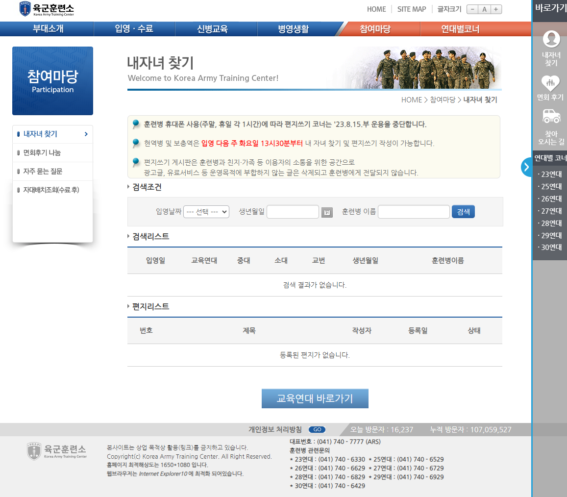 한국 대한민국 육군훈련소 인터넷 편지쓰기 출력 지원 중단 안내