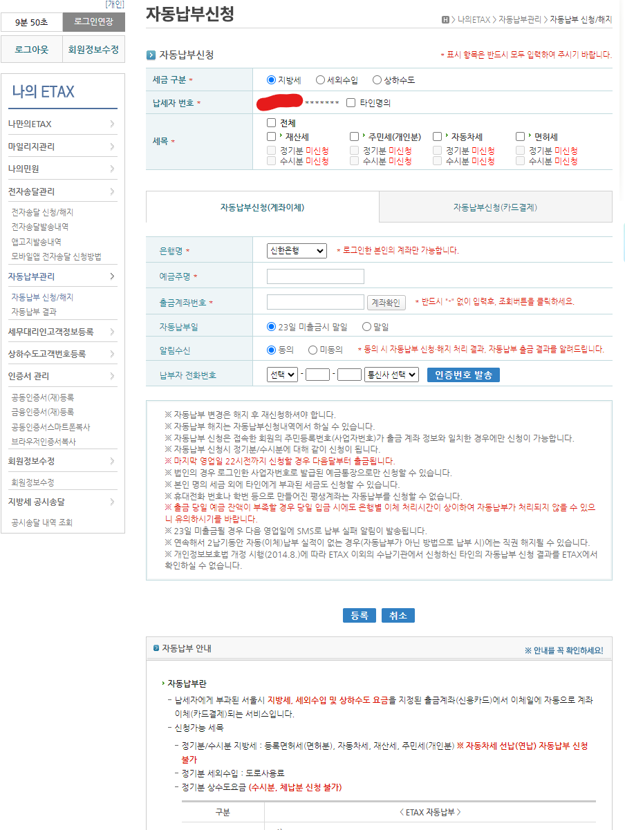 | 납부 계좌 변경 | 변경 시 재신청 필요 | ETAX에서 처리 가능 |